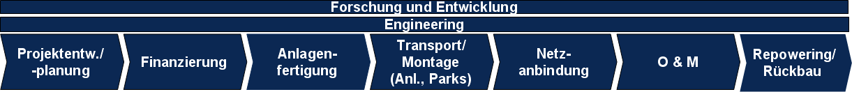 - Die Wertschöpfungskette für den Bereich Offshore-Windenergie ist hinsichtlich der einzelnen Wertschöpfungsstufen bei einer Betrachtung der ersten Ebene identisch mit der Wertschöpfungskette Onshore.